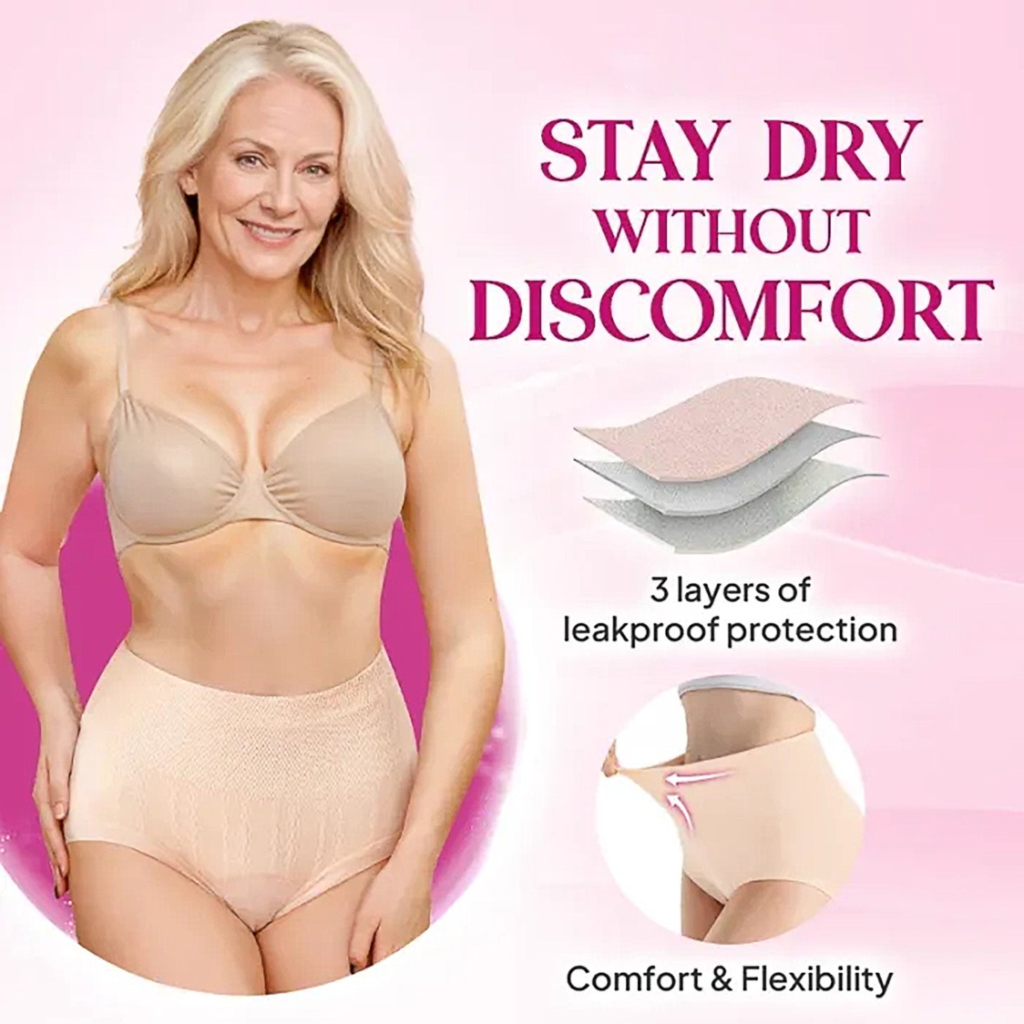 The 3 layers work together to prevent leaks. The top layer wicks moisture, the middle layer blocks leaks, and the bottom layer keeps you dry. It’s effective for light bladder leakage or period protection.