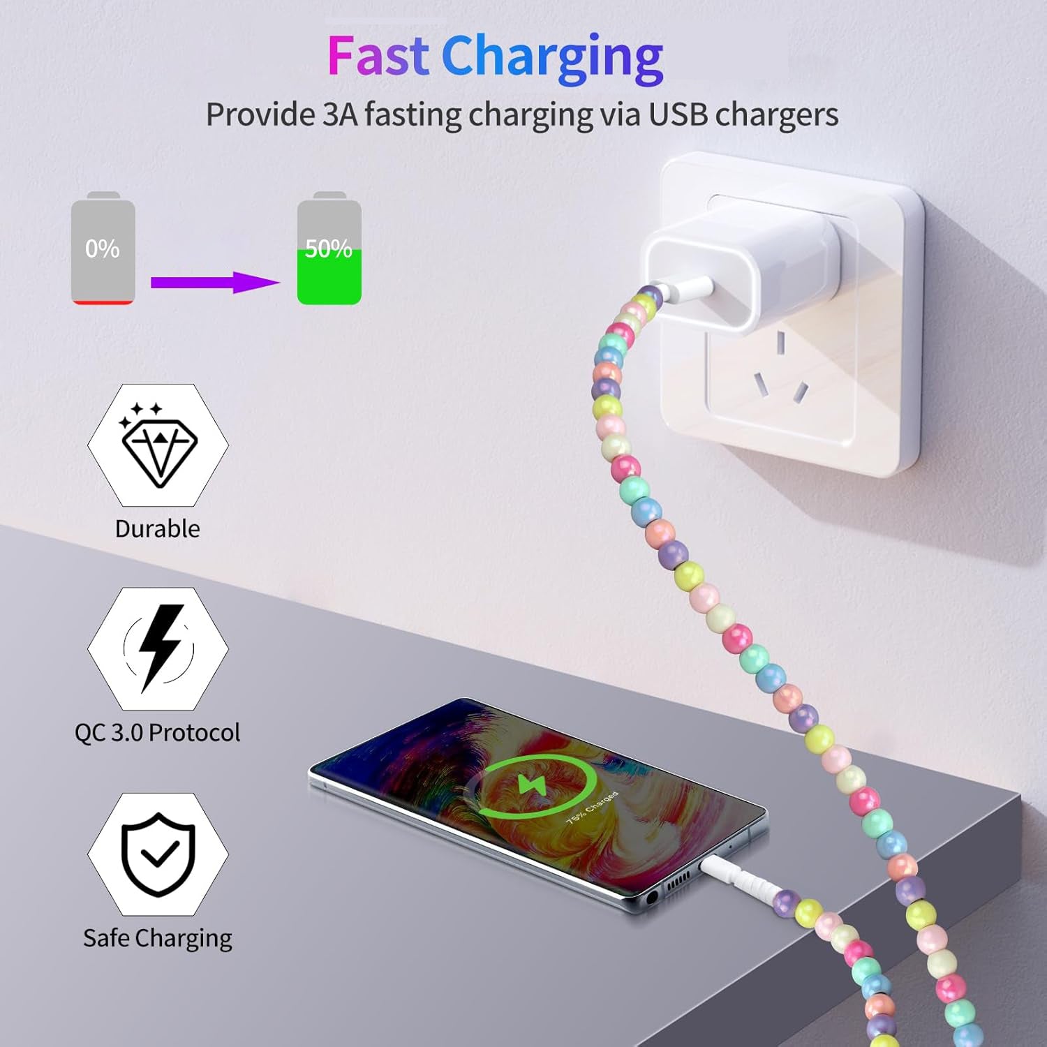 🌈 Colorful Beaded Designs: Playful USB C cable with colorful vibrant beads in various shapes like spheres, beads encasing the cable for a glamorous look. Charging Cable charming charging cord is a practical accessory that doubles as a charming decorative piece for ipad charger cable.