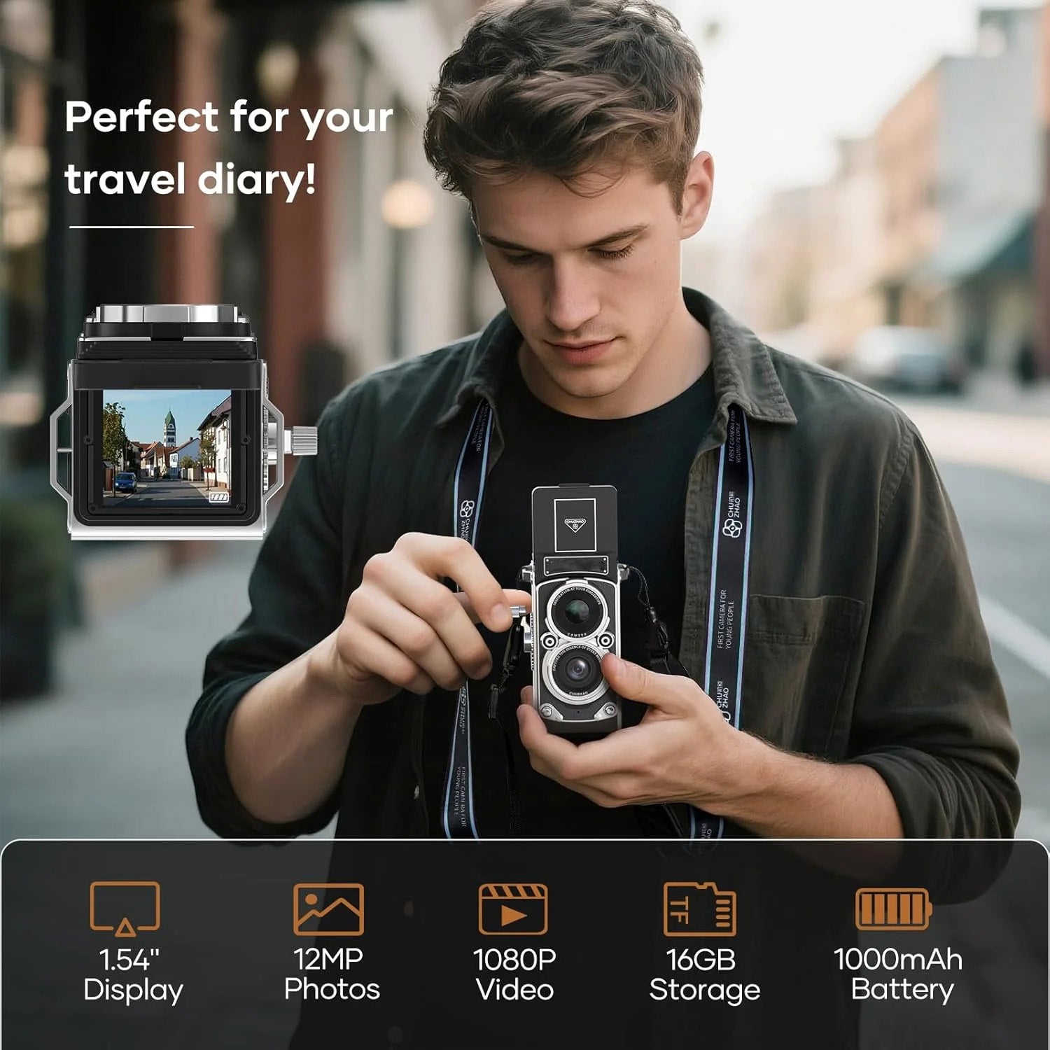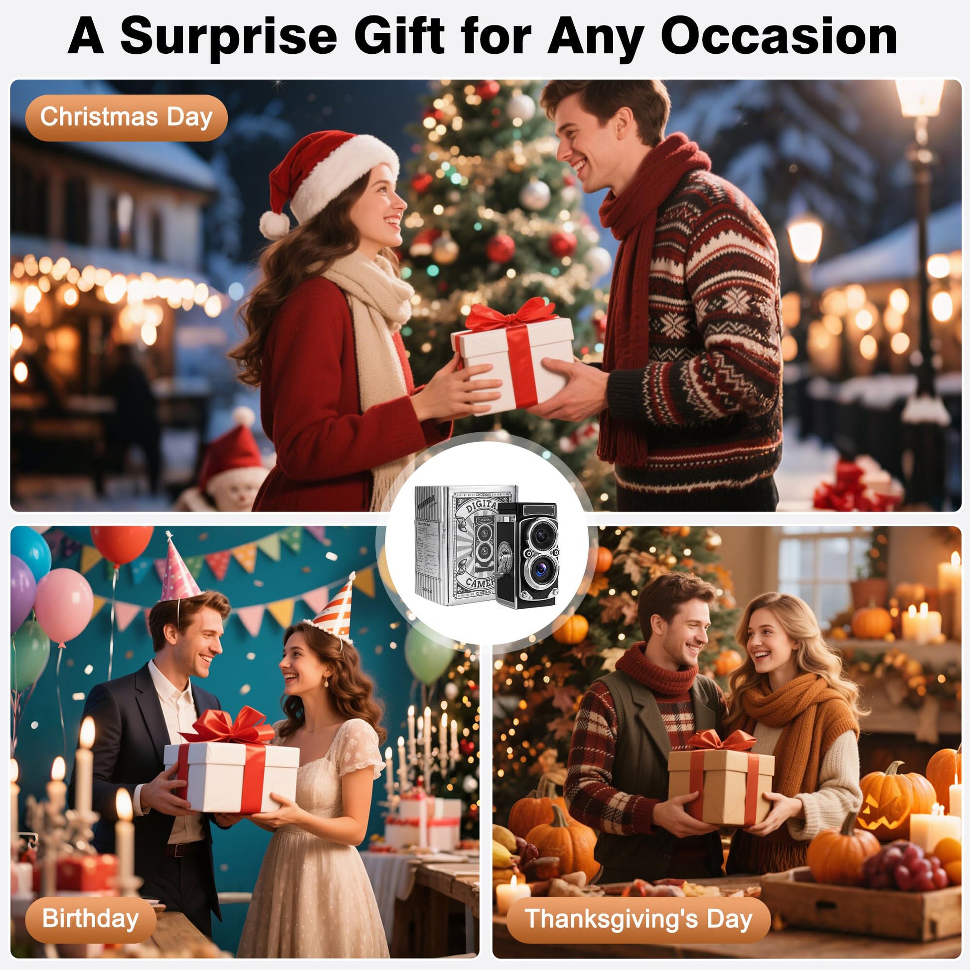 This retro digital camera has autofocus and can easily capture FHD 1080P videos and 12-megapixel retro photos. There is no need to manually adjust colors, brightness or complicated settings. Just press the shutter to capture precious moments, making shooting simple and fun! It can also capture photos in different retro styles, such as color or black and white.
