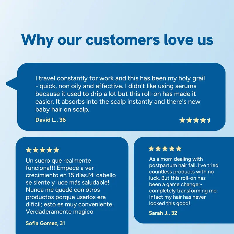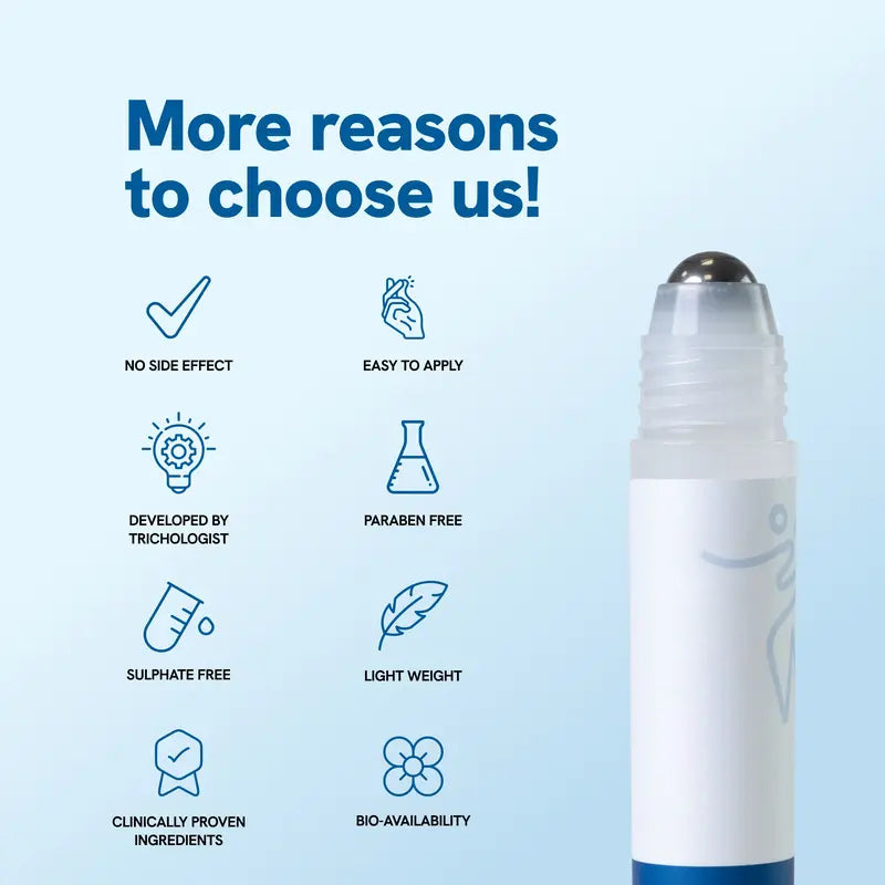 Our powerful roll-on serum is designed for men who want real, visible results—fast. With Redensyl, Anagain, rosemary oil, and copper peptides, it targets the root cause of hair loss and helps hair grow stronger and thicker.