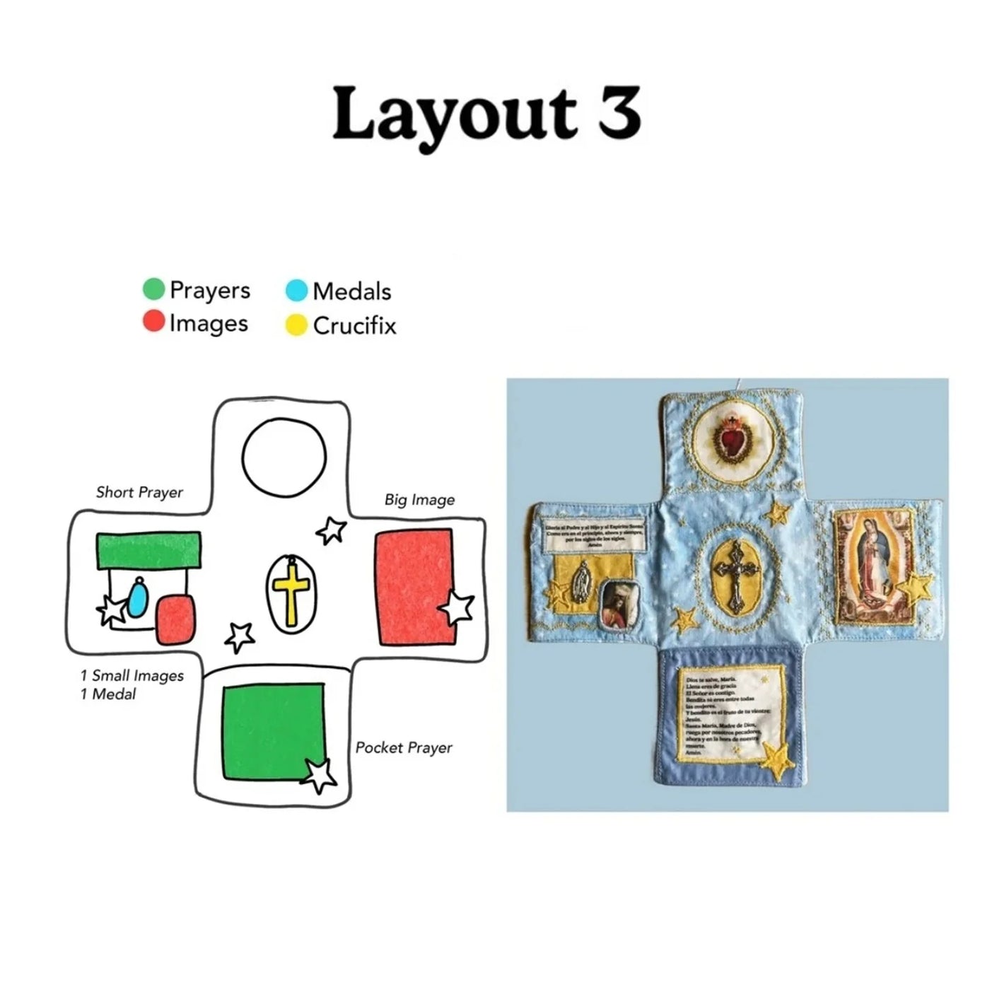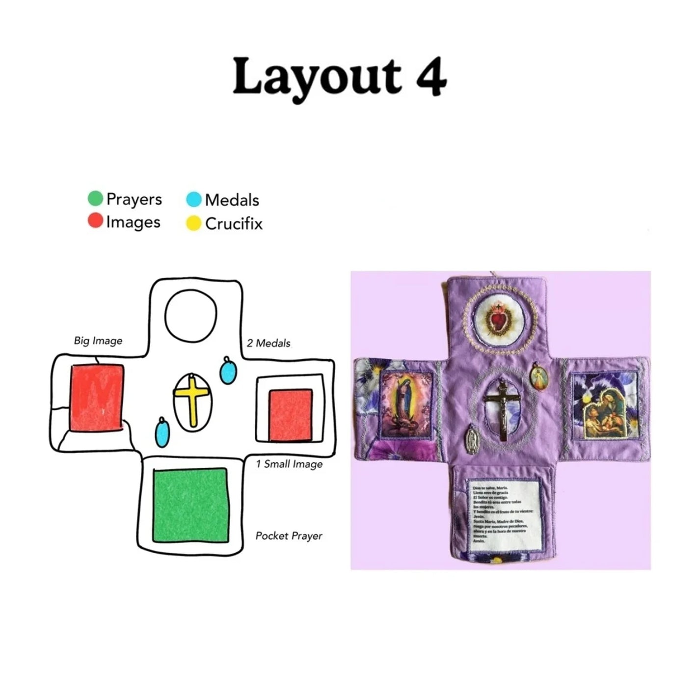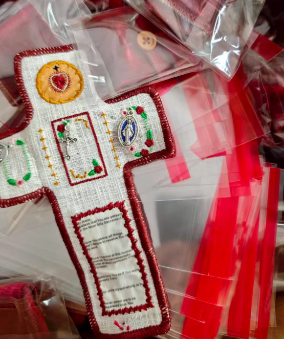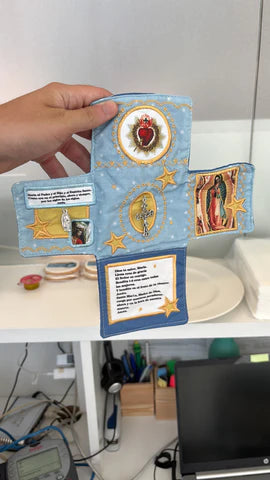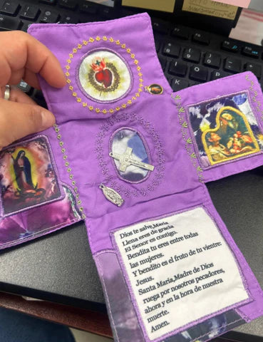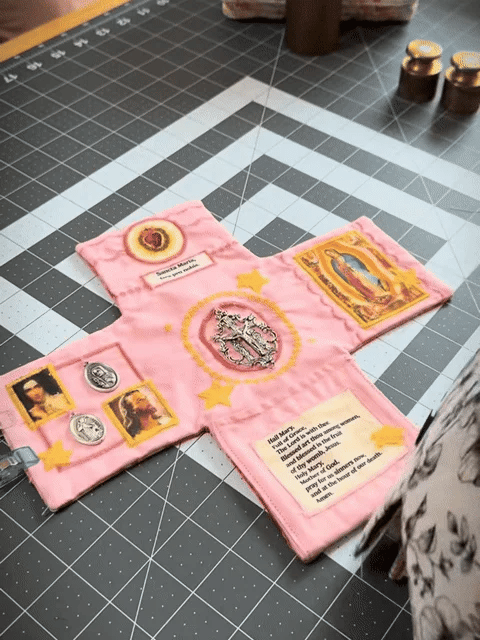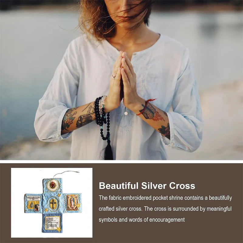 Admire the delicate, hand-stitched design! Each shrine features embroidered accents, embedded sacred icons (Sacred Heart, Marian imagery, silver cross), and careful detailingโall crafted by hand to honor its spiritual purpose.