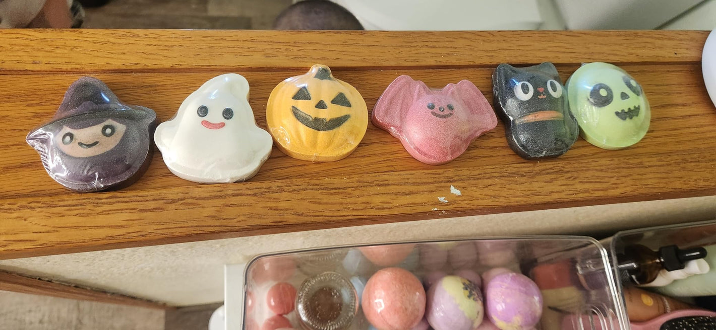 Dive into Halloween cheer with 6 handmade bath bombs in adorable spooky shapesβpumpkin, ghost, witch, bat, black cat, and spider. Each bomb fizzes to release vibrant color, enchanting scents, and skin-nourishing natural ingredients, making bath time a festive treat for kids, teens, and women alike.