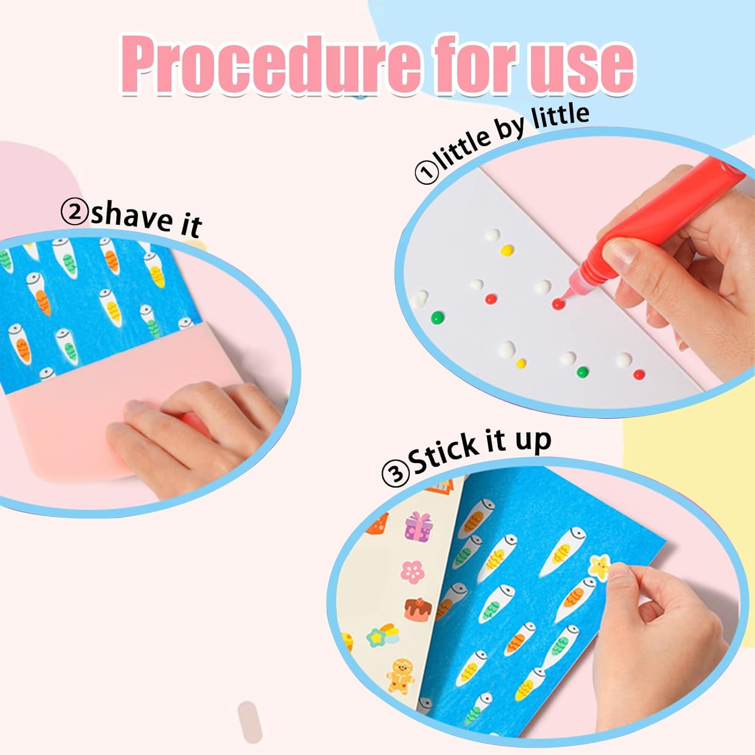 No skills? No problem! Just 3 steps: dot paint, scrape with the tool, stick on cute decals. Clear “Procedure for use” guides little hands to make gorgeous rainbow art. Even beginners nail masterpieces—so satisfying!