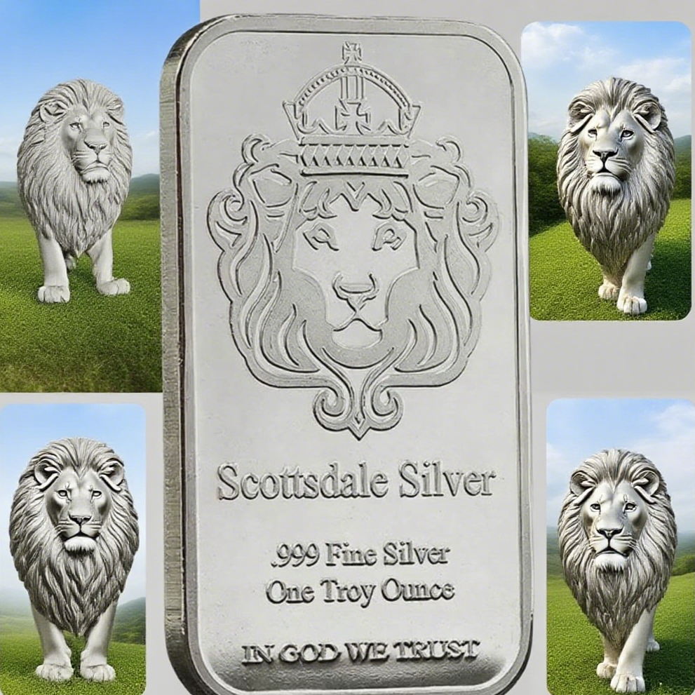 The design of the Scottsdale silver bar centers on the image of a lion wearing a crown on the front of the bar. As a symbol of strength and nobility, the lion, combined with the crown element, not only conveys the precious nature of the precious metal itself but also implies a tribute to classics and authority, demonstrating traditional aesthetics and cultural heritage. At the same time, text labels such as "Scottsdale Silver" and "999 Fine Silver" clearly indicate the brand and purity of the silver bar, allowing the design to not only have an artistic sense but also directly reflect its value attribute as a precious metal product, achieving an organic integration of artistic expression and value transmission.