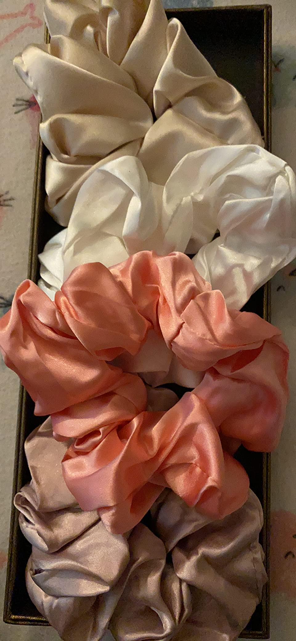 These scrunchies look exactly like they do on the website. I have fine, medium thick hair and they hold my ponytail nicely without pulling or damaging my hair and look really nice. The 4 colors included all the basics. It is exactly what I wanted. I was very happy with this purchase.