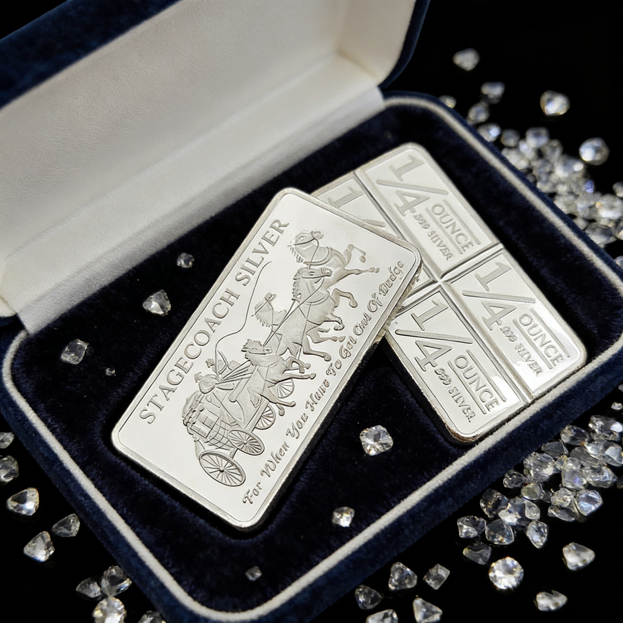 The Stagecoach Silver Bar - 1/4 Divisible Bar revolutionizes precious metals, combining American West heritage with an innovative divisible design that solves traditional silver bars’ inflexibility. Crafted for investors and collectors alike, it’s a trusted, versatile asset ideal for seasoned investors seeking liquidity, beginners starting small, or collectors chasing unique, story-driven pieces.