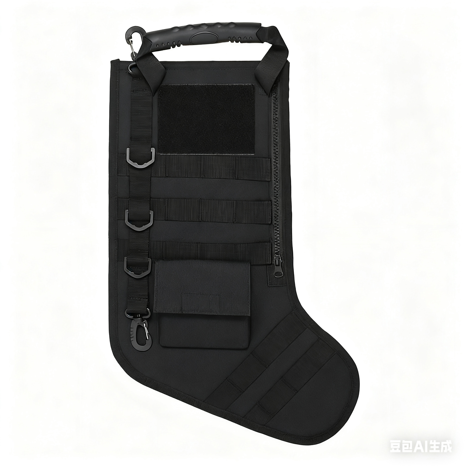 Christmas stocking are comed with 2 compact adhesive fastener pockets, 1 hanging hook, 1 main pocket with zippe, 1 handle, MOLLE webbing to provide enough space for gifts.(Does not contain the U.S. flag )