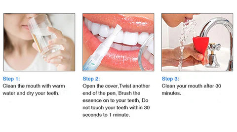 Slep 2: Open the cover.Twist anotherend of the pen, Brush theessence on to your teeth. Don't touch your teeth within 30 seconds to 1 minute.